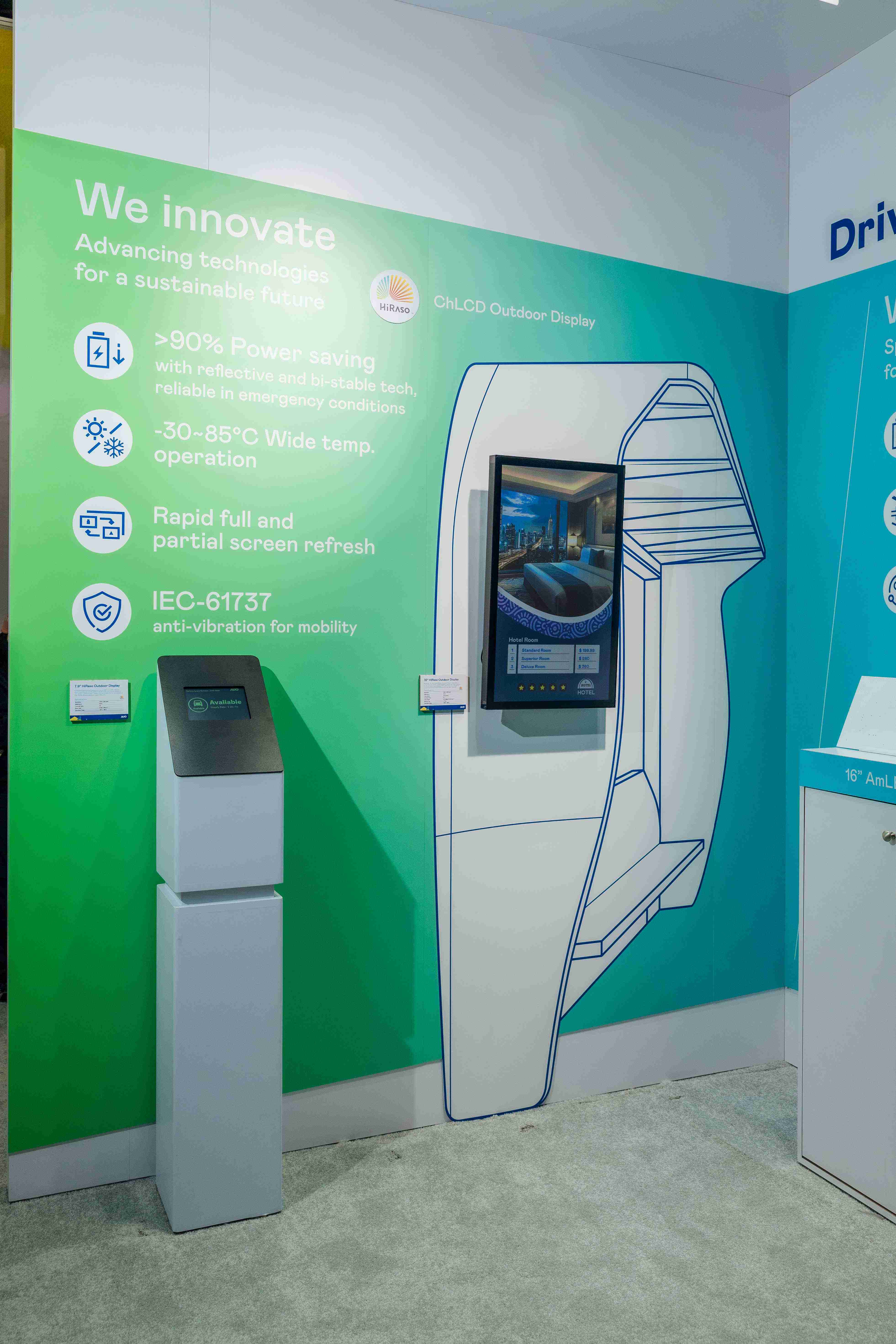 HiRaso胆固醇液晶显示器运用反射环境光线的方式,,,,呈现影像显示时零耗能的环保省电诉求,,,,光线愈强愈能呈现绝佳的色彩饱和度及显示效果,,,,同时在摄氏-30度至85度间宽温的使用优势,,,为户外电子看板的新首选。。